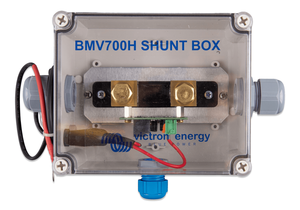 BMV-700H levereras med en rund huvudenhet, en fyrkantig frontram, en skruvring för montering, en 10 m UTP RJ12-kabel, en säkrad matningskabel samt en 500 A/50 mV-shunt. För att hantera den höga spänningen är shunten skyddad i ett särskilt hölje, vilket säkerställer både säkerhet och pålitlighet.