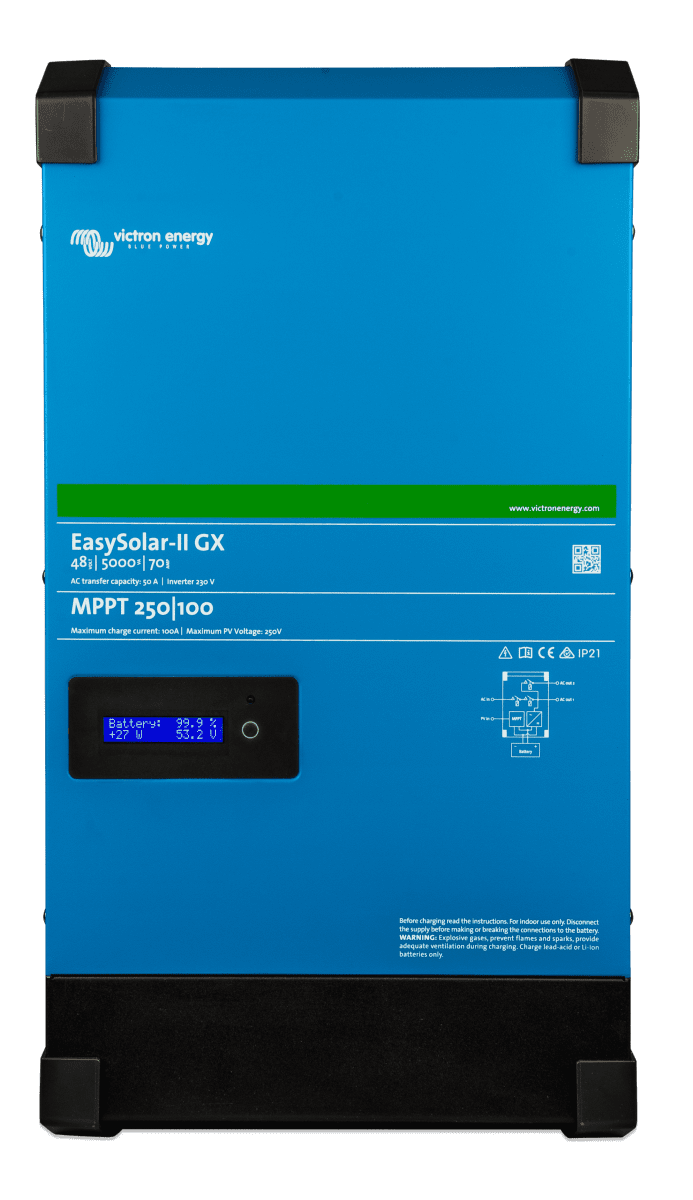 EasySolar-II 48/5000/70-100 MPPT levereras komplett med batterikablar för enkel installation, vilket gör det lätt att snabbt sätta upp och komma igång utan att behöva hantera separata komponenter. Allt är samlat i en kompakt enhet, vilket underlättar både installation och drift.