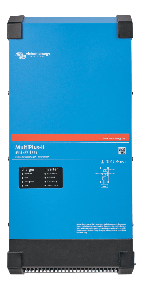 Den robusta konstruktionen, IP21-klassningen och driftintervallet på -40 till +65 °C gör att enheten fungerar även i krävande miljöer. Skydd mot kortslutning, överspänning, överhettning och låg batterispänning finns inbyggt. Precis som tidigare modeller är MultiPlus-II mångsidig, driftsäker och flexibel – men med förbättrad prestanda, framtidssäkrad funktionalitet och ökad effektivitet för moderna energisystem.