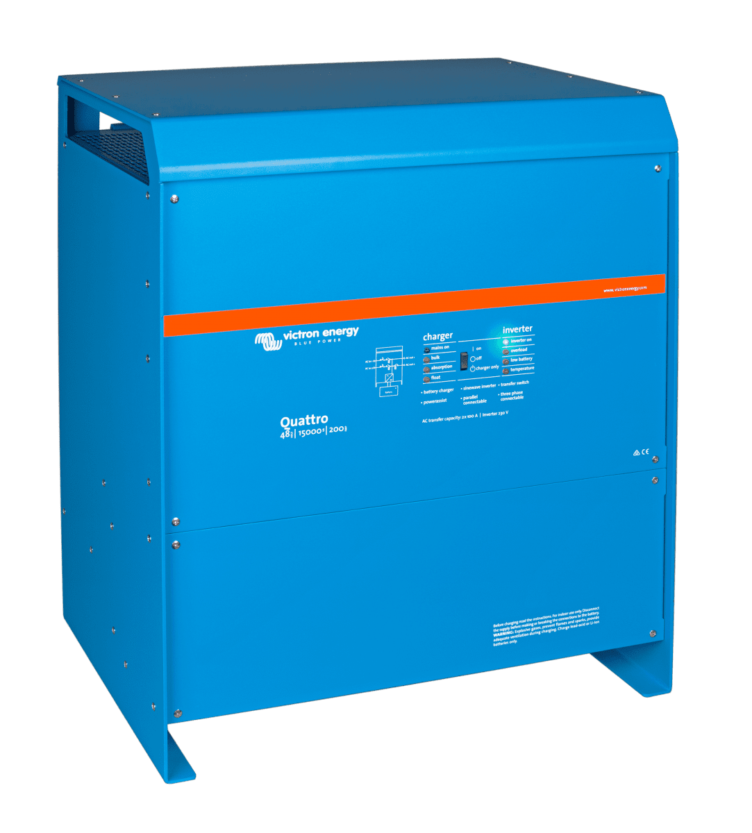 Quattro 48/15000/200-100/100 230V från Victron Energy är en avancerad växelriktare och batteriladdare som erbjuder hög prestanda och flexibilitet. Det som särskiljer Quattro från MultiPlus är dess dubbla AC-ingångar, vilket ger möjlighet att ansluta två separata strömkällor, exempelvis både landström och generator. Enheten växlar automatiskt mellan dessa strömkällor beroende på tillgänglighet, vilket garanterar en oavbruten strömförsörjning, även när en av strömkällorna faller bort.