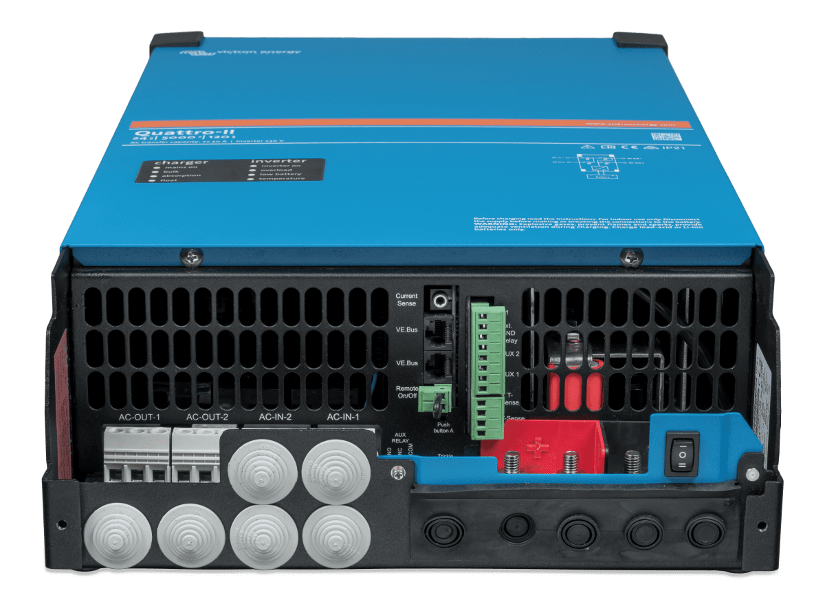 Quattro-II 24/5000/120-50/50 230V är en kraftfull och flexibel kombinerad växelriktare och laddare som erbjuder en rad avancerade funktioner för smidig energihantering. Den kan hantera två AC-ingångar, exempelvis landström och generator, och ansluter automatiskt till den aktiva energikällan. Detta gör Quattro-II idealisk för applikationer där en stabil och tillförlitlig strömförsörjning är nödvändig.