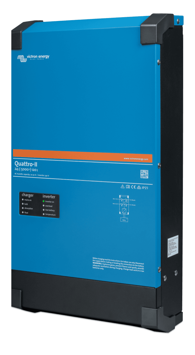 För de som har större strömbehov kan Quattro-II drivas parallellt i upp till sex enheter för att uppnå högre uteffekt, och trefasdrift är även möjligt för krävande tillämpningar. I ett system med sex Quattro-II-enheter kan en maximal uteffekt på 25 kW (30 kVA) uppnås med en total strömkapacitet på 420 A. Detta gör enheten utmärkt lämpad för stora energisystem där högre kapacitet och flexibilitet behövs.